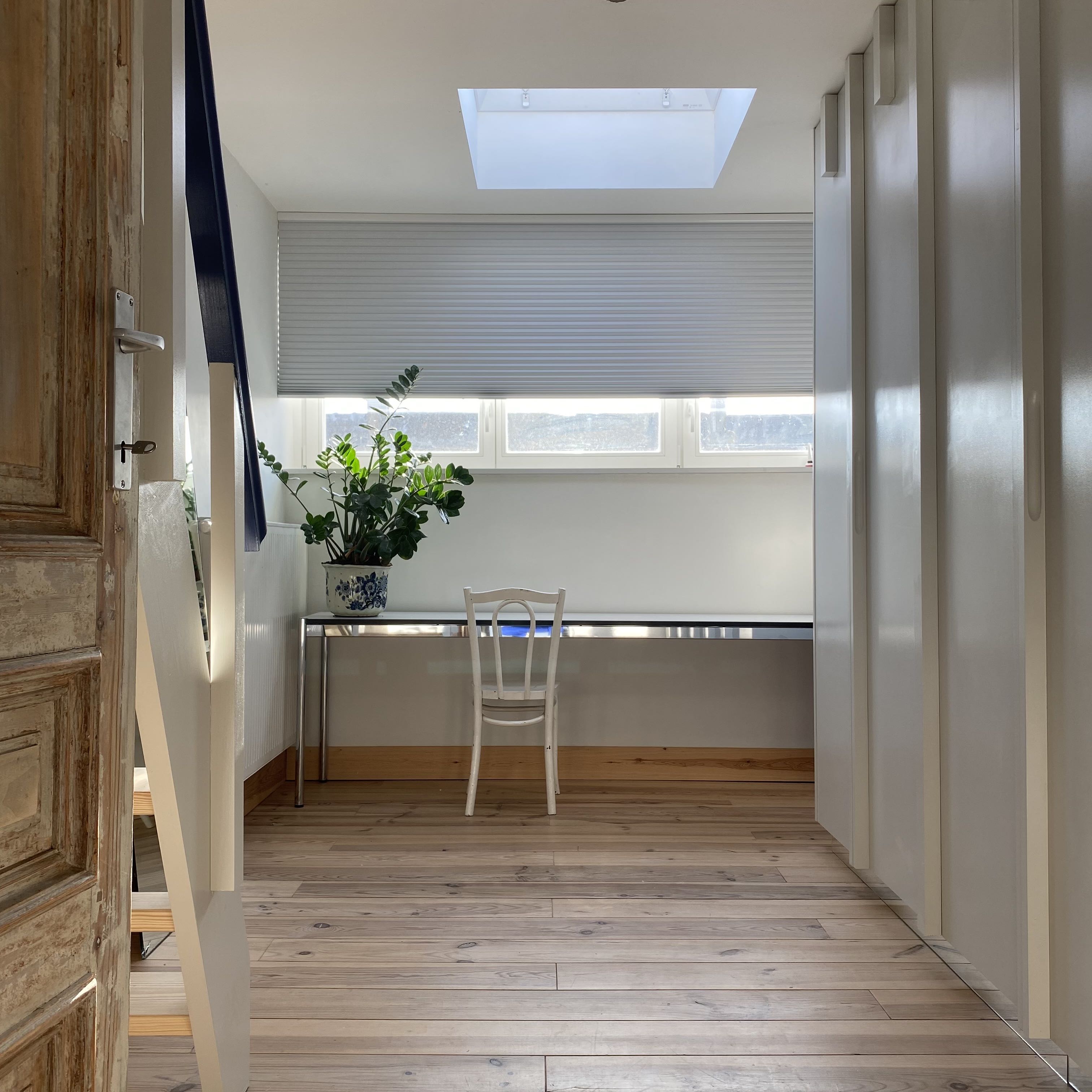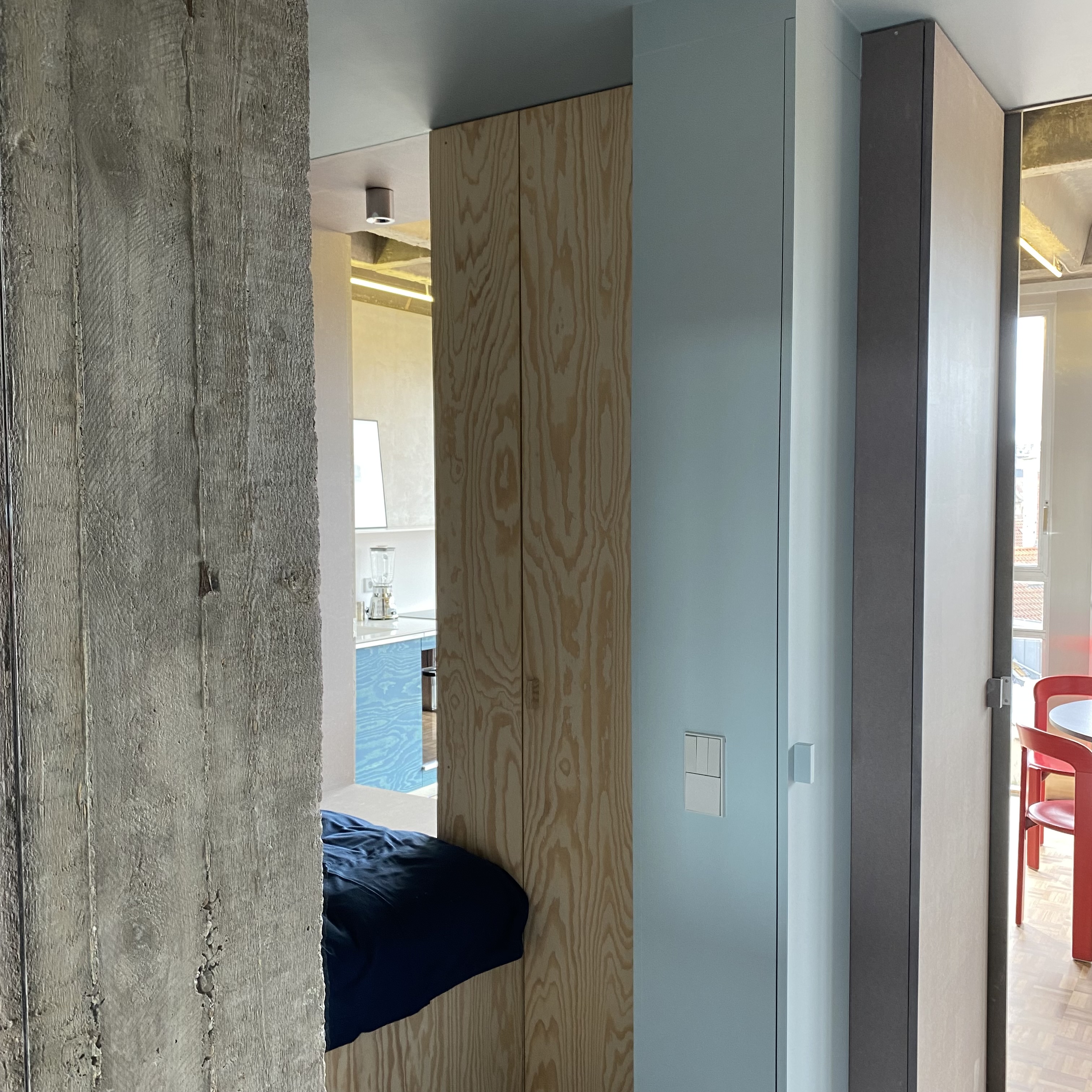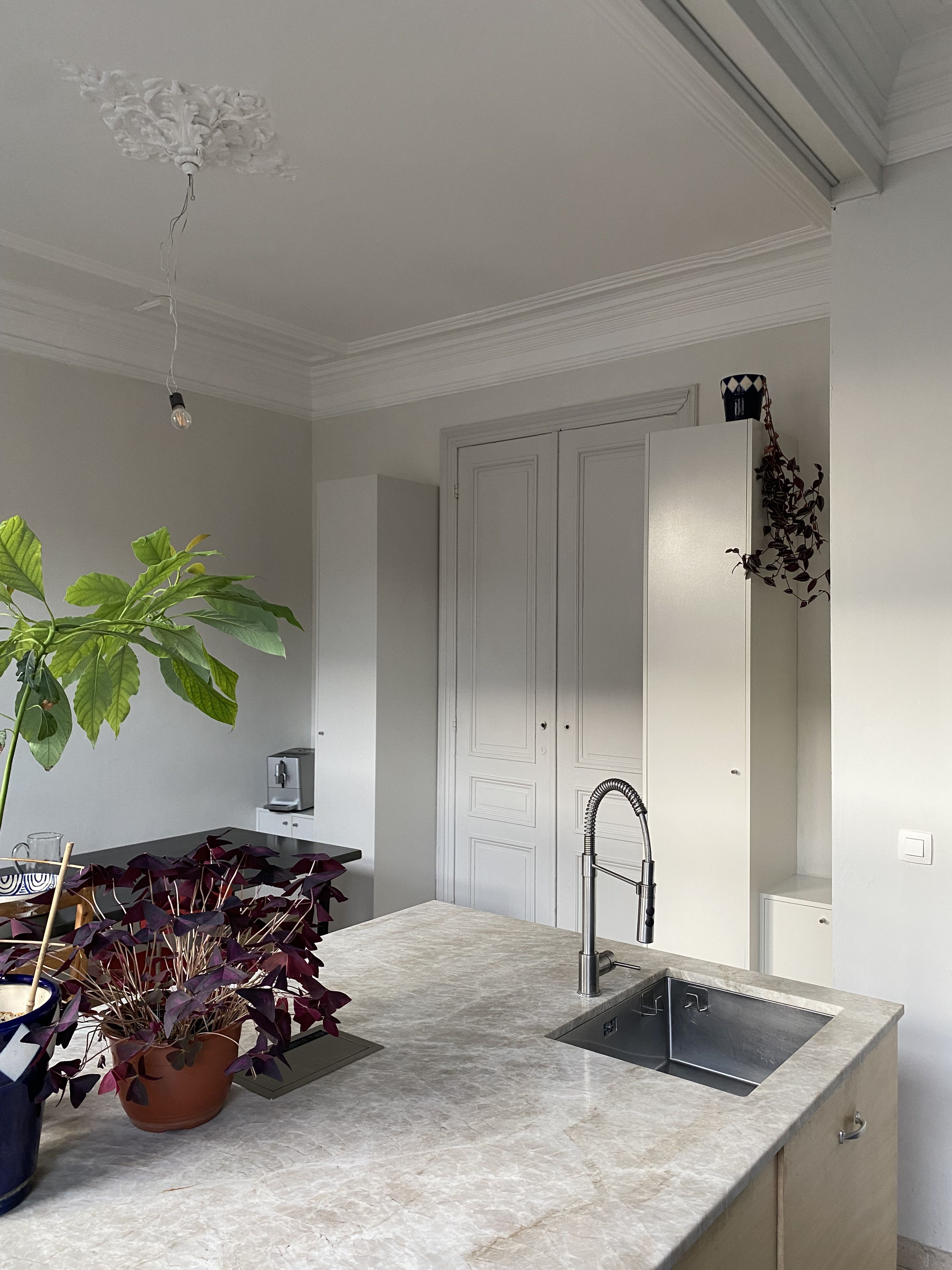 Our clients fell in love with the many original sixties features that are well preserved in this flat in Paris. We proposed to modernise but with respect of its soul. Walls were stripped of its wallpaper, carpets removed to reveal beautiful parquet floors and a new opening was created between the living room and guest room to be able to enjoy the view and abundance of daylight. A highlight is the original boat kitchen where we subtly integrated new kitchen appliances.