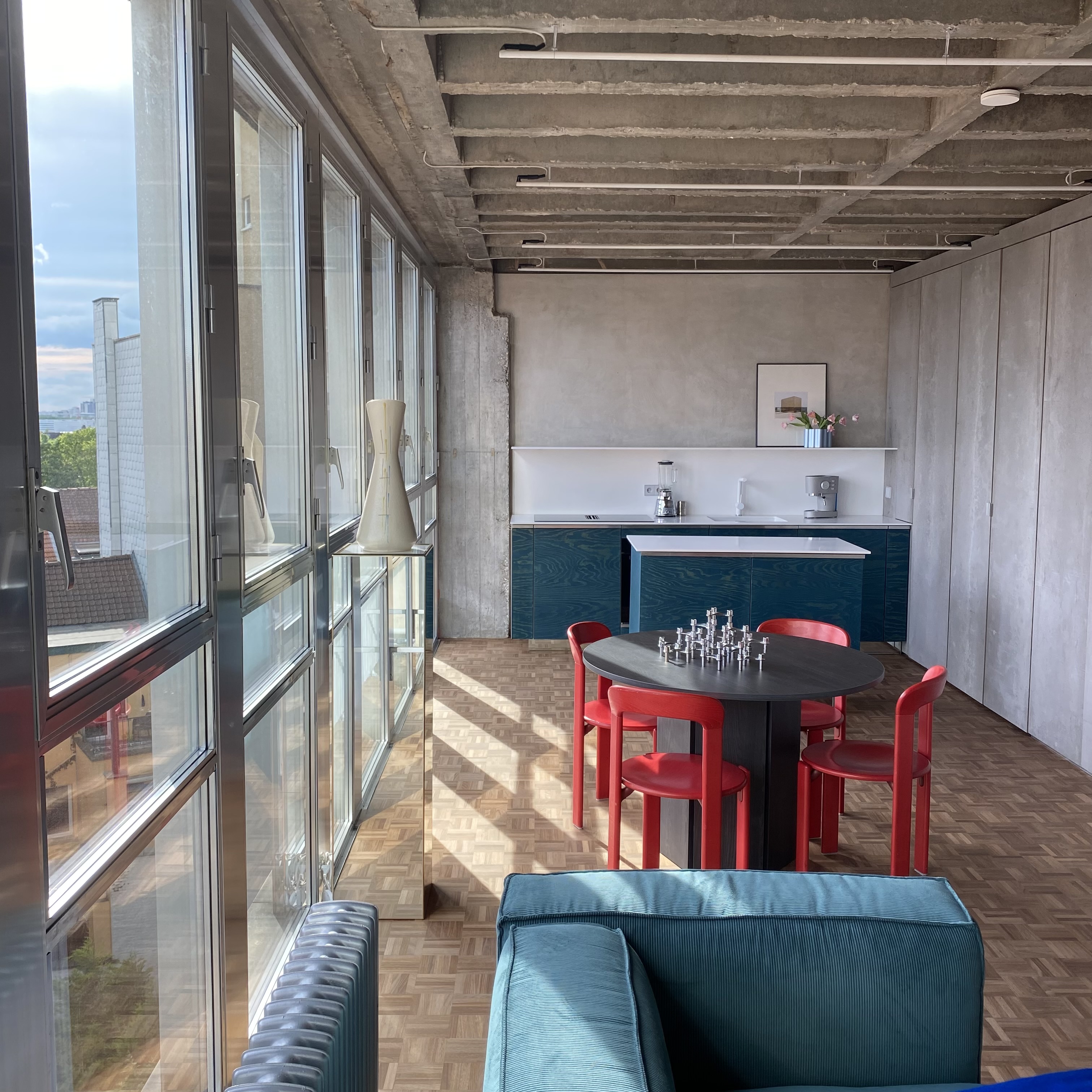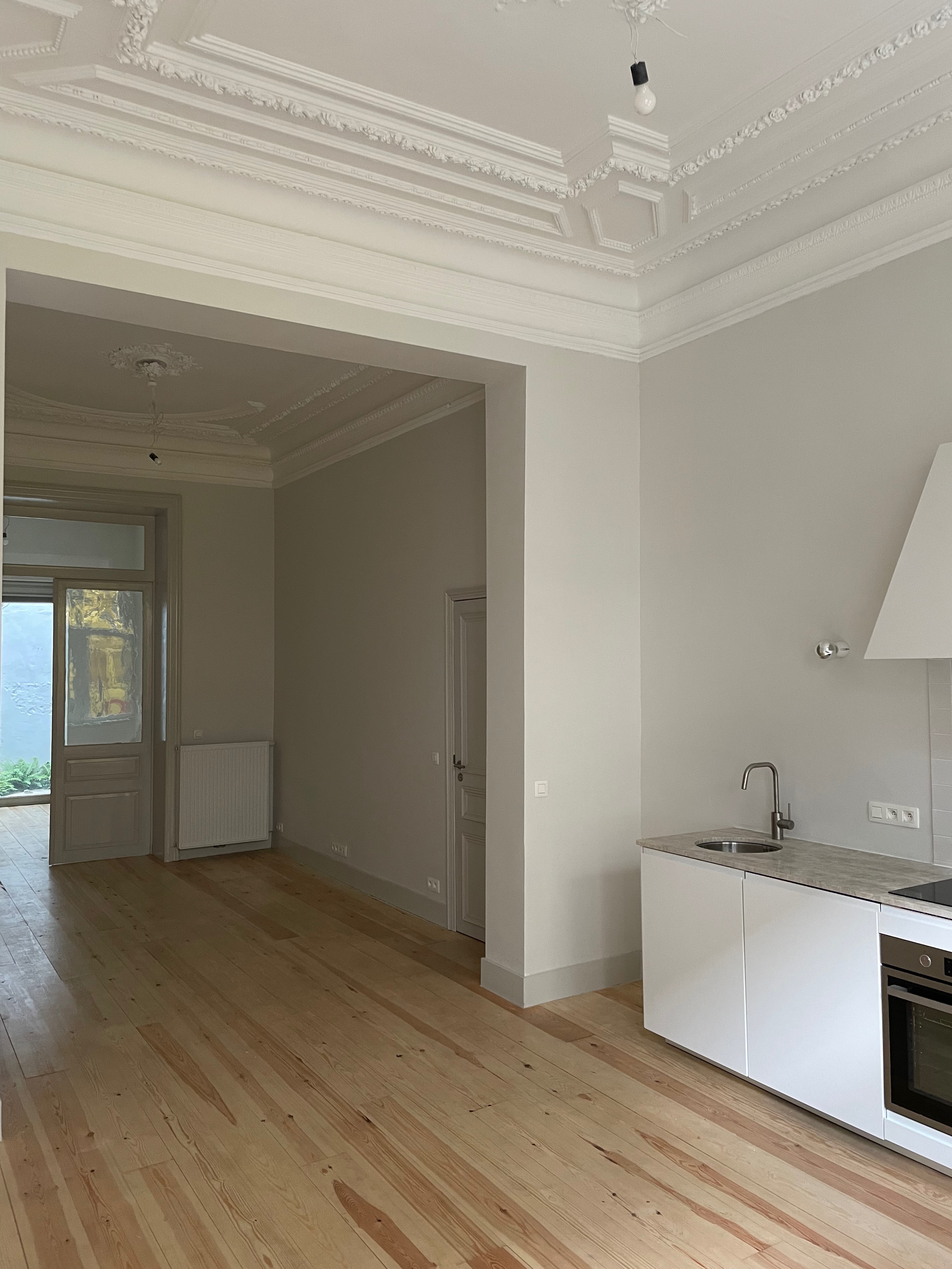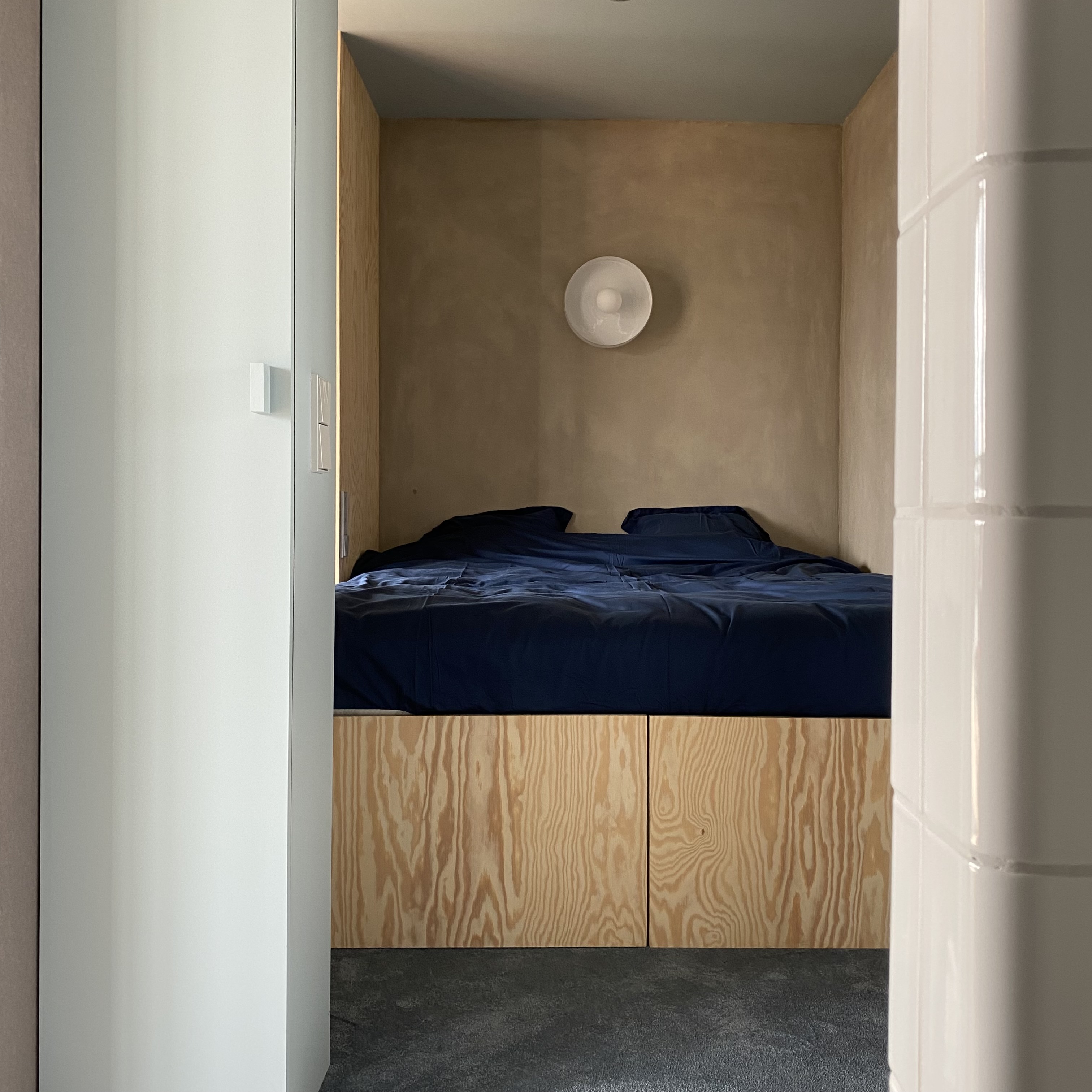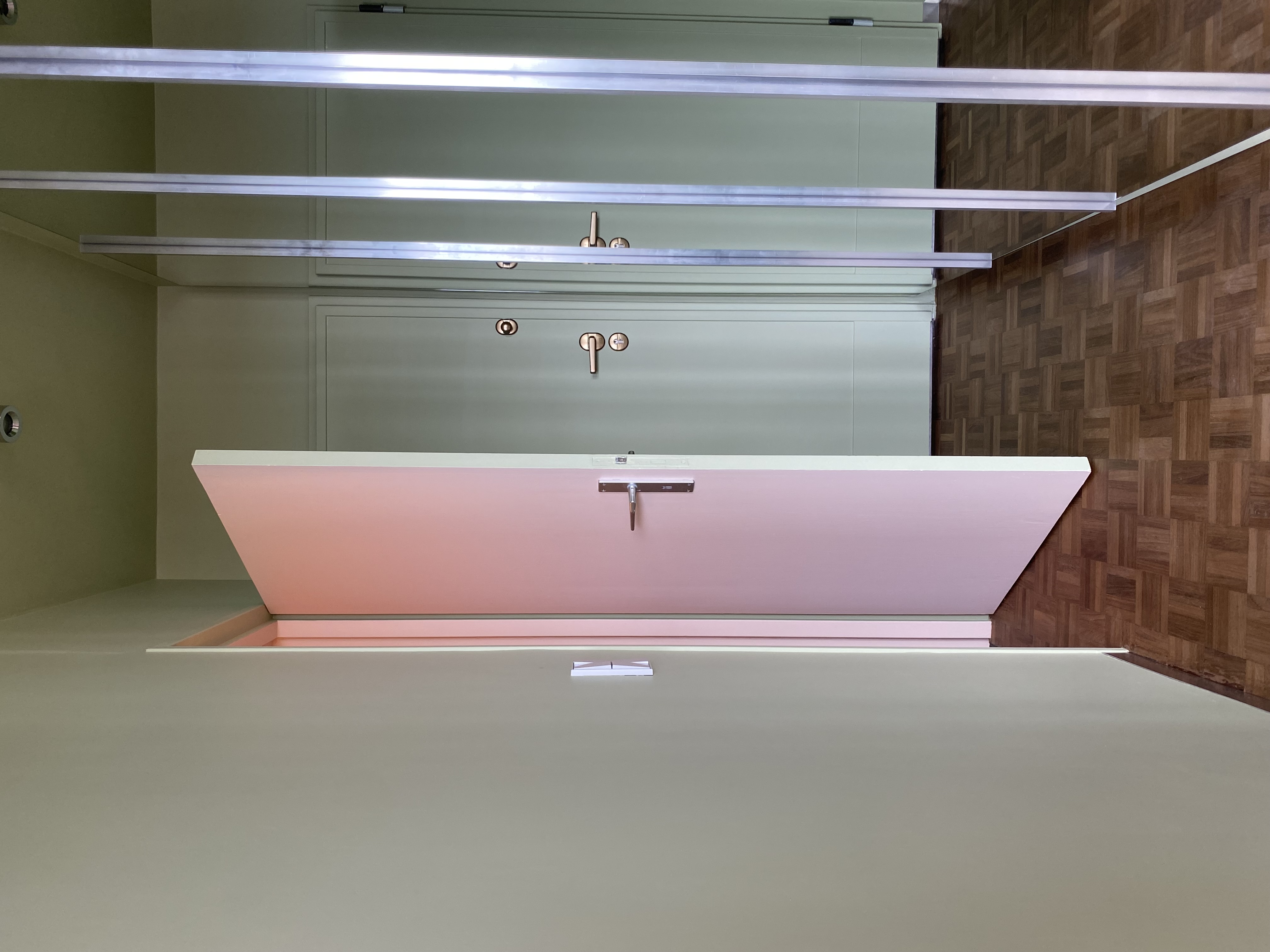 Our clients fell in love with the many original sixties features that are well preserved in this flat in Paris. We proposed to modernise but with respect of its soul. Walls were stripped of its wallpaper, carpets removed to reveal beautiful parquet floors and a new opening was created between the living room and guest room to be able to enjoy the view and abundance of daylight. A highlight is the original boat kitchen where we subtly integrated new kitchen appliances.